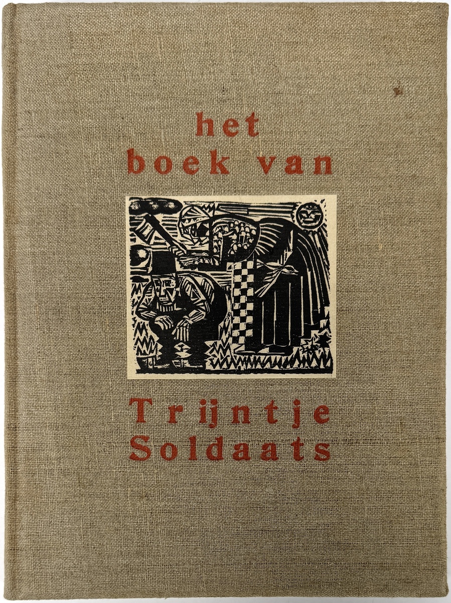 Het Boek van Trijntje Soldaats (eerste deel), een gebonden boek met een linnen kaft, uitgegeven in 1928 door P. Noordhoff, Groningen. De Groninger Volksvertellingen werden verzameld door E. J. Huizenga-Onnekes. Het boek bevat expressionistische houtsneden en initialen door Johan Dijkstra (1896–1978), een prominent lid van de Groninger kunstkring De Ploeg.