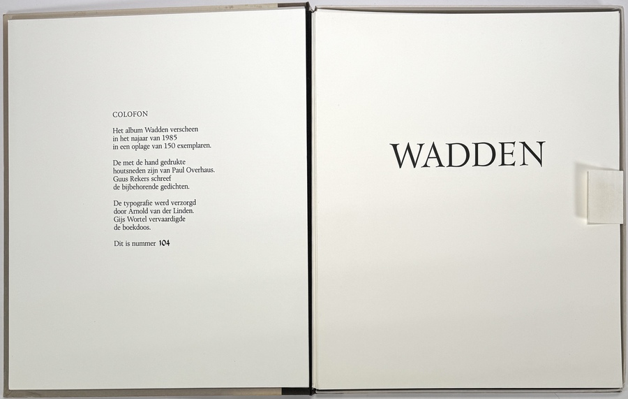 Het album “Wadden” uit 1985 bevat handgedrukte houtsneden van Paul Overhaus (1935-2014) en gedichten van Guus Rekers (1938-2015), gedrukt op papier. Gebundeld in een genummerde oplage van 150 exemplaren, dit is nummer 104, ingebonden in een uitgave met linnen rug, Nederlands werk waarin abstracte landschapselementen van het Waddengebied worden verbeeld via houtsnede-techniek.