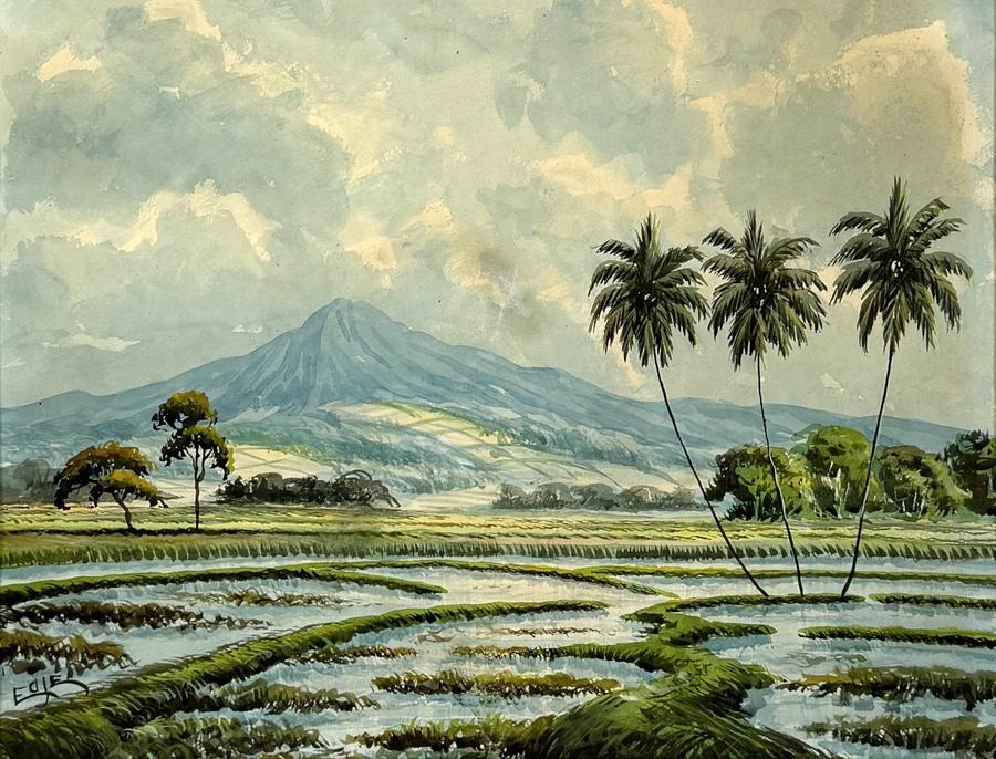 Aquarel van de kunstenaar Edje gedateerd op de eerste helft 20e eeuw (circa 1920–1940). De aquarel op papier toont een tropisch landschap met rijstvelden op de voorgrond, palmbomen en een vulkaan op de achtergrond. Het werk is uitgevoerd in de sfeervolle "Mooi Indië" stijl, typerend voor de Nederlandse koloniale kunst. Het werk is linksonder gesigneerd.