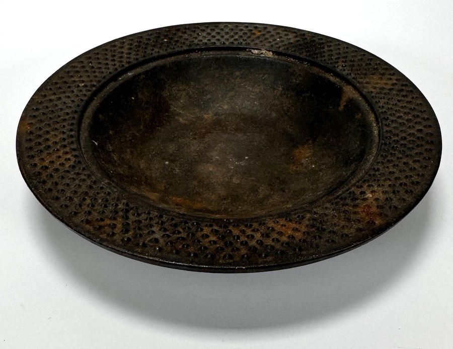 Japanse gietijzeren schaal vervaardigd in de traditie van Nambu Tekki in de regio Iwate Prefecture, uitgevoerd in gietijzer met gepunte reliëfstructuur en brede opstaande rand, vermoedelijk midden 20e eeuw. Onderop bevindt zich een rechthoekig merkteken met de kanji 南部 (Nambu).
