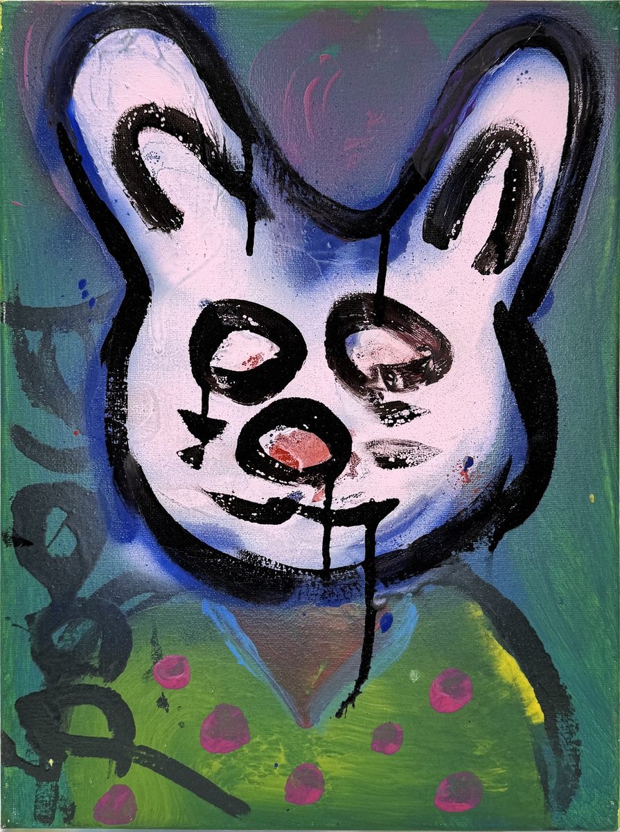 Acrylverfschildering op doek, vervaardigd eind 20e eeuw in een expressionistische stijl naar Herman Brood. Een gestileerde voorstelling van een konijnachtig figuur in zwart, roze en blauw tegen een groene achtergrond met roze stippen, met expressieve penseelvoering en druiptechniek.