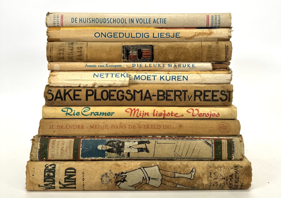 Verzameling van tien Nederlandse jeugdboeken en romans, gedrukt op papier en karton, daterend van circa 1920–1940. De kavel bevat boeken van onder anderen Ella Vemor en H. Brander, het geïllustreerde werk "Mijn liefste Versjes" van de bekende illustratrice Rie Cramer (1887–1977). De boeken, uitgegeven door onder meer Kluitman en De Arbeiderspers, zijn uitgevoerd in een expressieve Art Deco- en interbellumstijl en geven een beeld van de Nederlandse jeugdliteratuur van die periode.