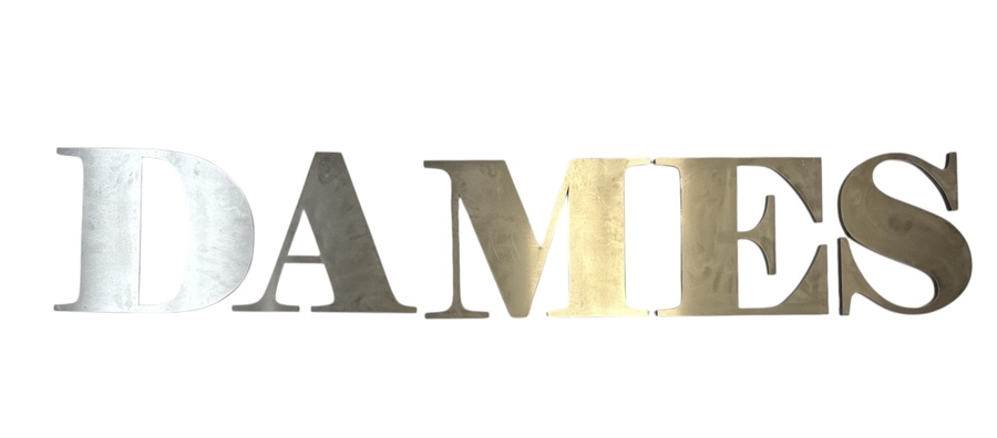 Vijf design gevelreclame letters die het woord "DAMES" vormen, gemaakt van roestvrij staal en kunststof, circa 2000–2025. De moderne letters zijn uitgevoerd in een strak sans-serif lettertype. Deze letters dienden als driedimensionale winkelreclame.