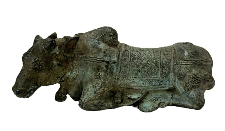 Bronzen beeld van de heilige stier Nandi, het rijdier van de hindoegod Shiva, gegoten met de verlorenwastechniek. Het beeld in traditionele Zuid-Aziatische stijl, daterend van eind 19e eeuw, toont de stier in liggende positie. Kenmerkend zijn de dikke, diepgroene patina en de gedetailleerde ceremoniële bedekking op de rug.