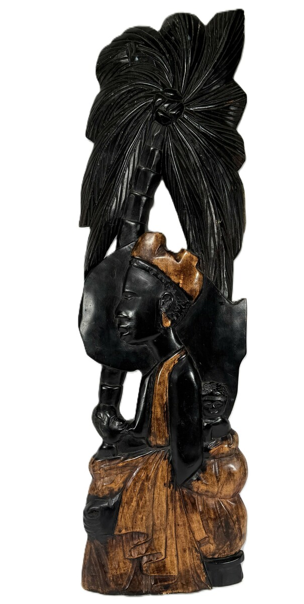 Houten Makonde wandpaneel, midden 20e eeuw, Tanzania. Het paneel toont een zittende vrouw met twee kinderen onder een palmboom, uitgevoerd in hardhout met contrast tussen donker en lichter hout. De voorstelling is figuratief en verticaal opgebouwd, met aandacht voor gelaatstrekken, gewaad en omliggende vegetatie. Achterzijde ruw afgewerkt.