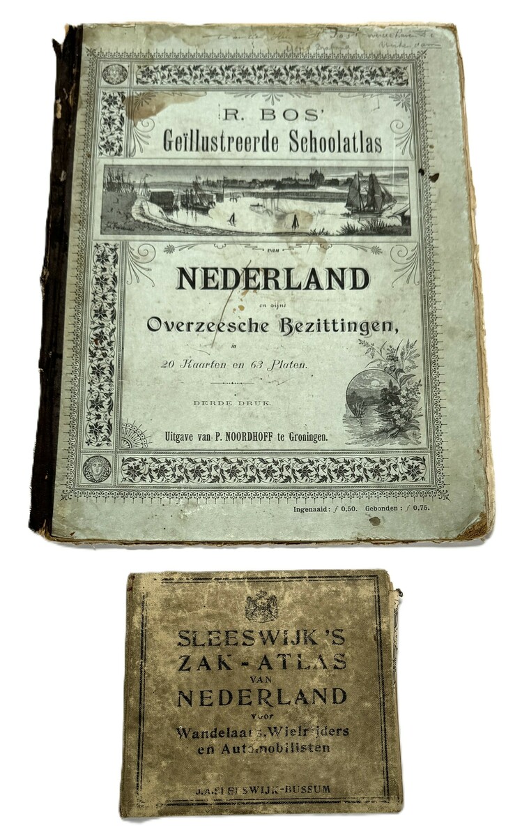 Twee Nederlandse atlassen uit de periode tweede helft 19e eeuw tot begin 20e eeuw. Een atlas "R. Bos’ Geïllustreerde Schoolatlas"(derde druk, P. Noordhoff) met kaarten en platen van Nederland en overzeese bezittingen, en "Sleeswijk’s Zak-Atlas van Nederland", een vroege atlas voor wielrijders en automobilisten. De schoolatlas is kenmerkend voor de educatieve uitgaven van destijds.