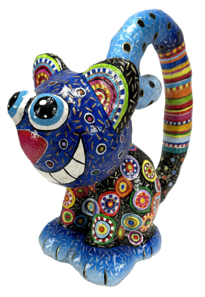 Hedendaags beeld van een kat, vervaardigd uit papier-maché en met de hand beschilderd. Het beeld is gesigneerd met SI '12' (2012). Kenmerkend is de expressieve, popartachtige stijl met een overdadige decoratie van meerkleurige, concentrische cirkels op een zwarte en blauwe ondergrond. Het beeld toont een zittende kat met een lachende uitdrukking en een gebogen gestreepte staart.