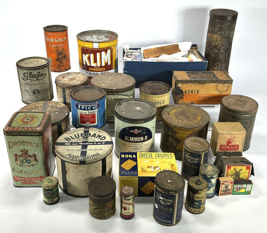Verzameling van meer dan twintig verpakkingsblikken en dozen, hoofdzakelijk vervaardigd uit gedecoreerd blik. De blikken dateren van circa 1890 tot 1960 en zijn afkomstig van diverse Nederlandse en internationale merken, waaronder Droste Cacao, Blue Band Margarine en KLIM Whole Milk. De blikken zijn uitgevoerd met offsetlithografie en vertegenwoordigen de commerciële verpakkingskunst uit het interbellum en de vroege naoorlogse periode.