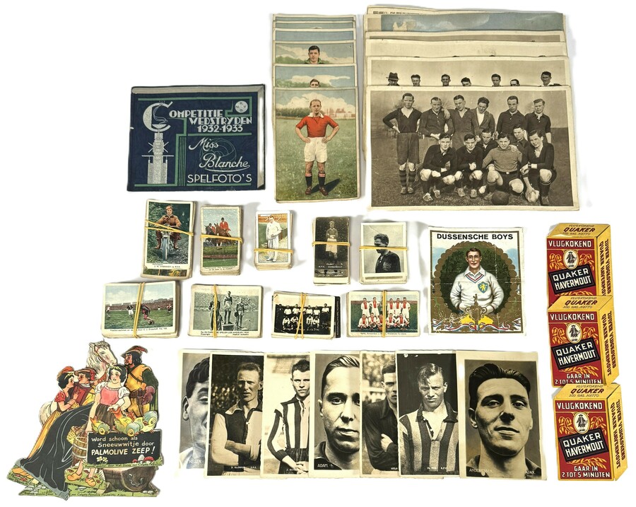 Verzameling Nederlandse reclame ephemera en verzamelprenten op papier en karton, daterend van circa 1925–1955. met onder andere diverse zwart-wit sportfoto's en -plaatjes, kartonnen reclame van Quaker havermout en een gestanste Palmolive zeepreclame.