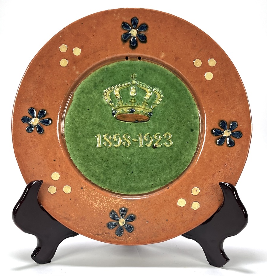 Aardewerk herdenkingsbord door Arnhem Fayence (A.F.), vervaardigd in 1923 ter gelegenheid van het 25-jarig jubileum van Koningin Wilhelmina. Het bord is uitgevoerd in een robuuste stijl met een kroon en de jaartallen 1898–1923 in reliëf. De techniek omvat meerkleurig glazuur op geperst aardewerk.