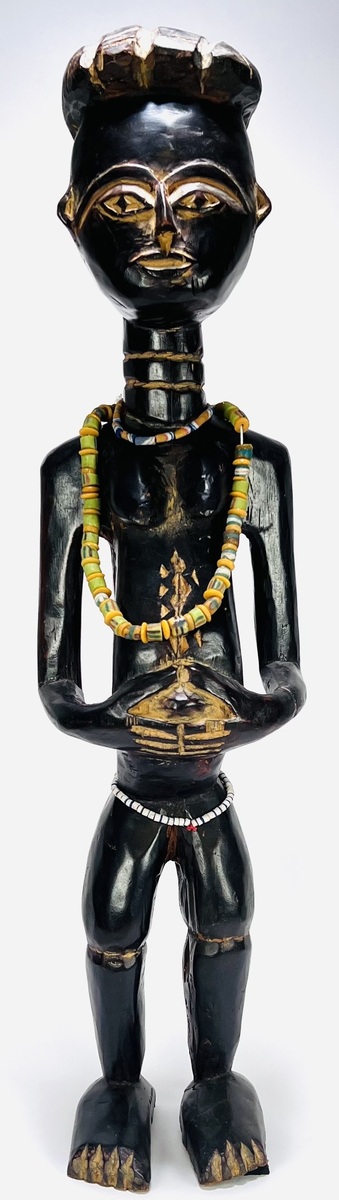 Houten vrouwelijk Luba beeld in uit Congo, midden 20e eeuw, met donkere patina en beschilderde littekens. Het beeld toont een staande figuur met ringen rond de nek, geometrisch gekerfd kapsel en kralensnoeren rond hals en middel.
