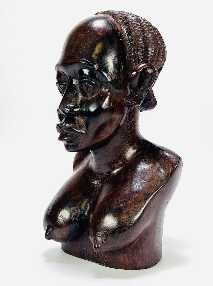 Luba buste, tweede helft 20e eeuw, afkomstig uit de Democratische Republiek Congo, in naturalistische stijl. Het beeld heeft een gladde afwerking en toont uitgesproken vrouwelijke kenmerken, kenmerkend zijn de amandelvormige ogen en het fijn gesneden cornrows kapsel. Uitgevoerd in donker tropisch hardhout met zichtbare nerf en traditionele snijtechniek.