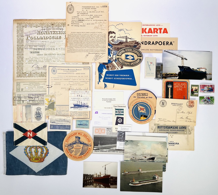 Brede collectie Nederlandse maritieme memorabilia, vanaf circa 1925, van toonaangevende rederijen zoals KNSM, Rotterdamsche Lloyd en HAL. De collectie bevat onder andere originele passagiersdocumenten (gedateerd 1938/1939), emaille insignes, postkaarten en promotioneel drukwerk in Art Deco stijl.