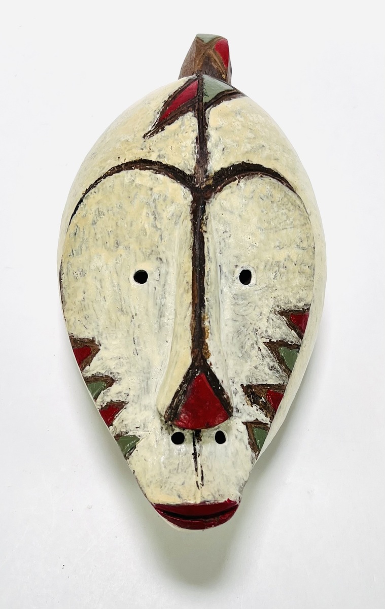 Keramisch Punu wandmasker uit Gabon, midden 20e eeuw, vervaardigd uit gebakken klei en beschilderd met polychrome pigmenten in wit, rood, groen en zwart. Het masker toont een ovaal gezicht met smalle ogen, driehoekige geometrische decoratie en doorboringen langs de rand voor bevestiging. Het diende als ritueel object binnen de context van de Punu cultuur.