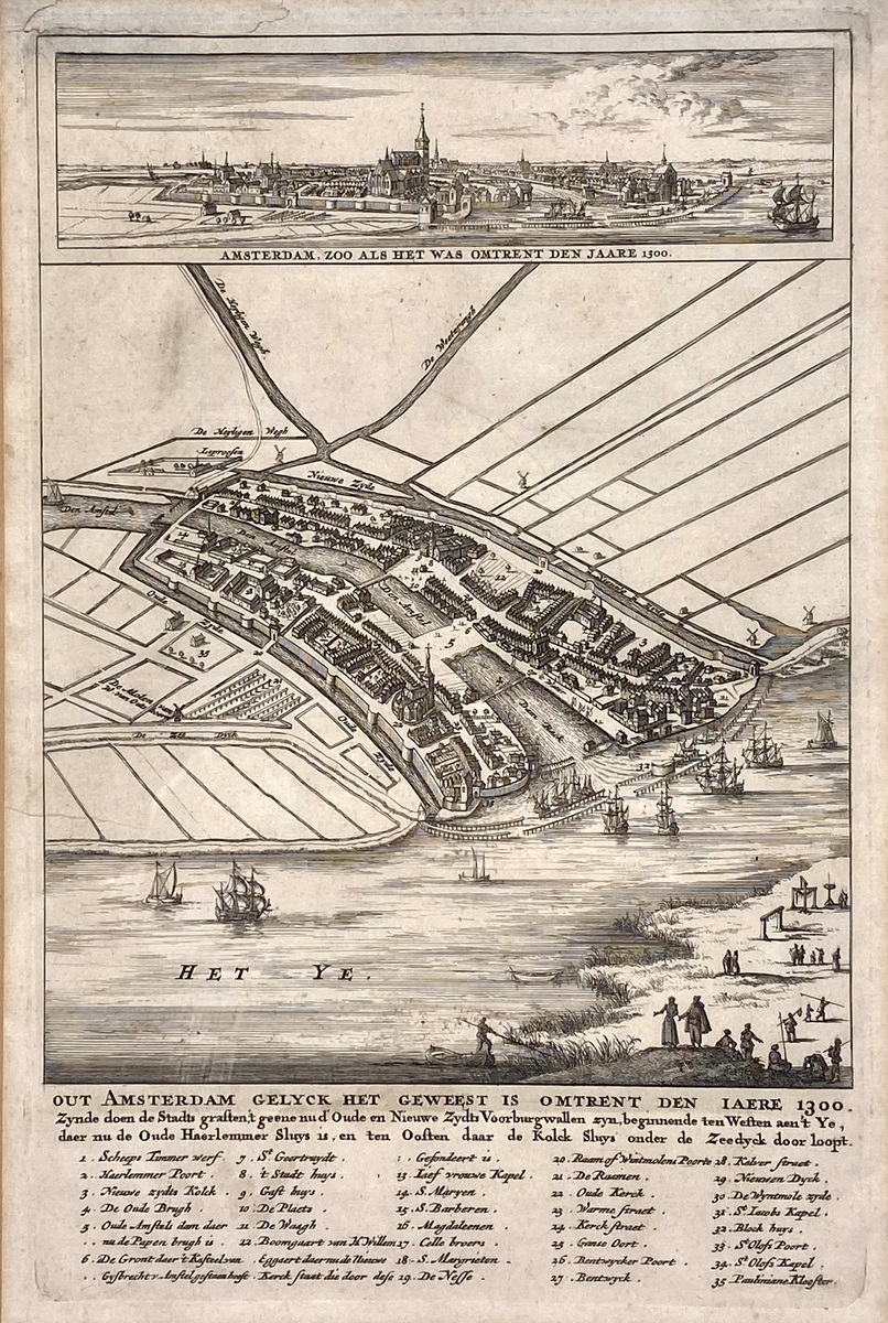 Gravure op papier met de voorstelling “Out Amsterdam gelyck het geweeſt is omtrent den jaere 1300”, naar de 17e-eeuwse uitgave van Claes Jansz. Visscher (1587–1652), tussen 1663 en 1664. De prent toont een vogelvluchtplattegrond en panorama van Amsterdam met legenda van 36 locaties. Ingelijst onder passe-partout met ouderdomsvlekken. Niet geïnspecteerd buiten de lijst.