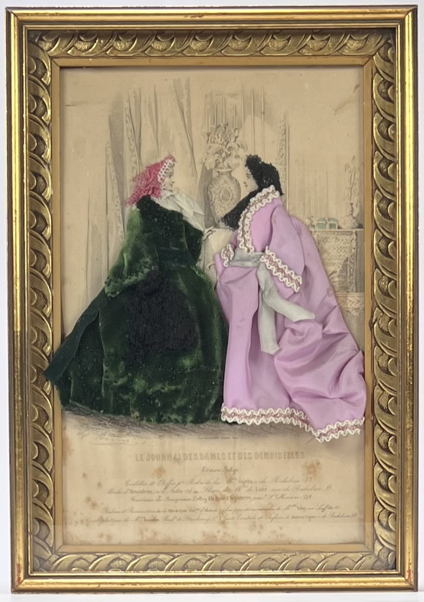 Ingelijste mixed media mode illustratie van "Le Journal des Dames et des Demoiselles", daterend uit circa 1850–1870. De basis is een gedrukte gravure in romantische stijl, waarbij de kleding van de twee dames is vervangen door driedimensionale applicaties van textiel (fluweel/zijde) en passementerie. Dit Victoriaanse handwerk uit Frankrijk toont de crinoline mode van het Tweede Keizerrijk. Het werk bevindt zich in een goudkleurige lijst.