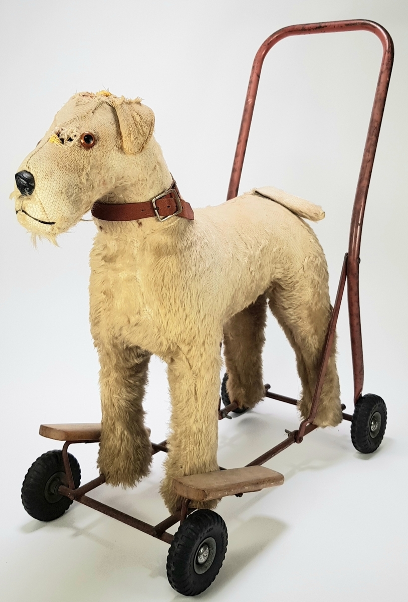Tri-ang houten en stoffen hond op wieltjes, geproduceerd door Lines Bros Ltd. in Engeland in de midden 20e eeuw (ca. 1945–1960). Het object bestaat uit een gevulde textiele hond en een robuust ijzeren frame met rubberen wielen, bestemd als duw- of loopvoertuig voor kinderen.