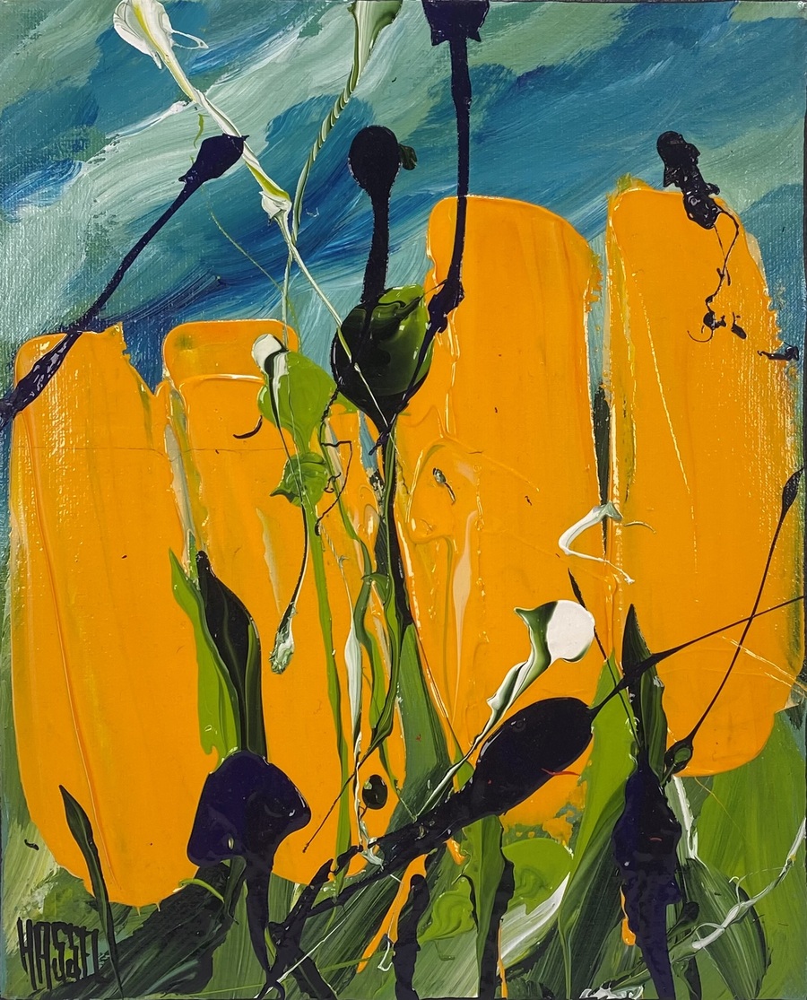 Acrylverfschilderij op doek is een modern expressionistisch werk van de Nederlandse kunstenaar Ad van Hassel (1953), gesigneerd 'HASSEL' linksonder. Het vierkante werk uit de 21e eeuw toont geabstraheerde grote oranje gele tulpen, uitgevoerd in impasto.