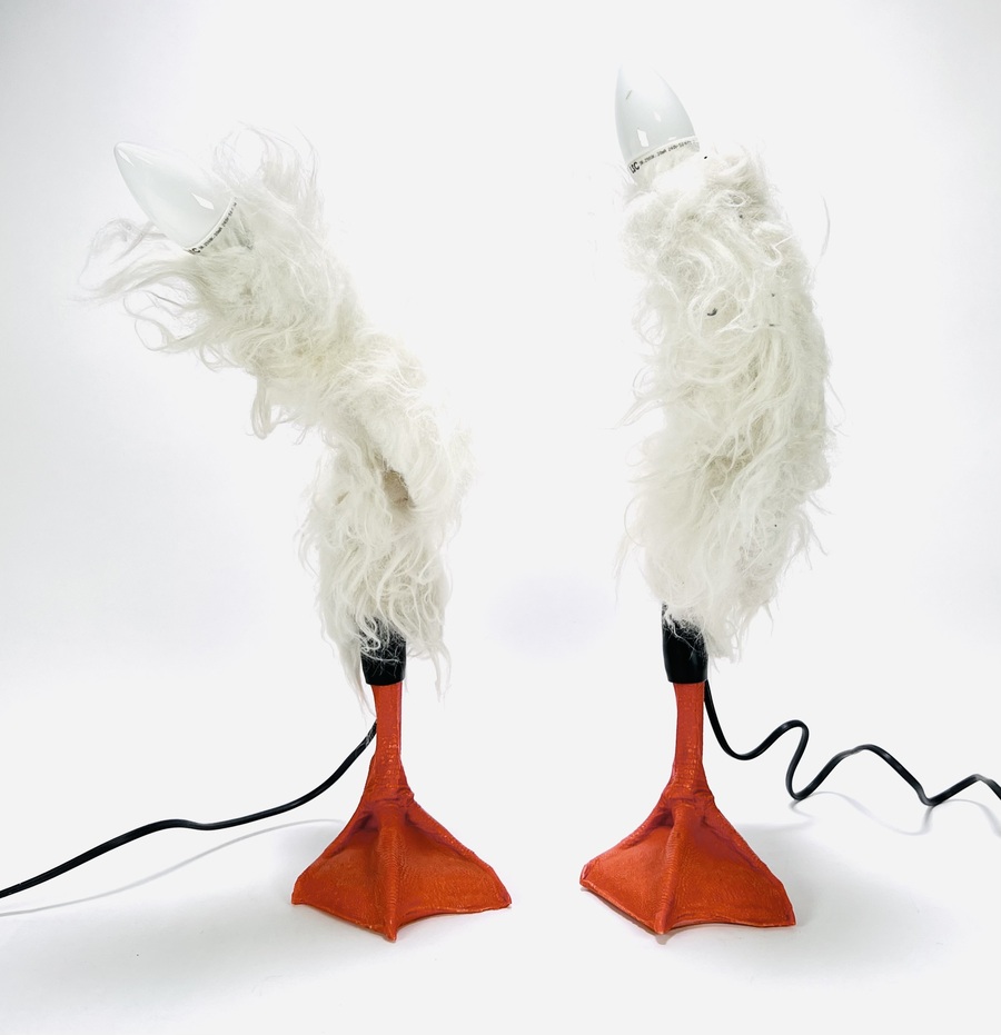 Stel van twee satirische tafellampen (popart Duck lamp), uitgevoerd in een postmoderne designstijl uit eind 20e eeuw. De lampen zijn vervaardigd uit gegoten kunststof en lange witte textielvezels. Het ontwerp toont een ironische weergave van ganzenpoten met een oranje basis en een pluizige schacht.