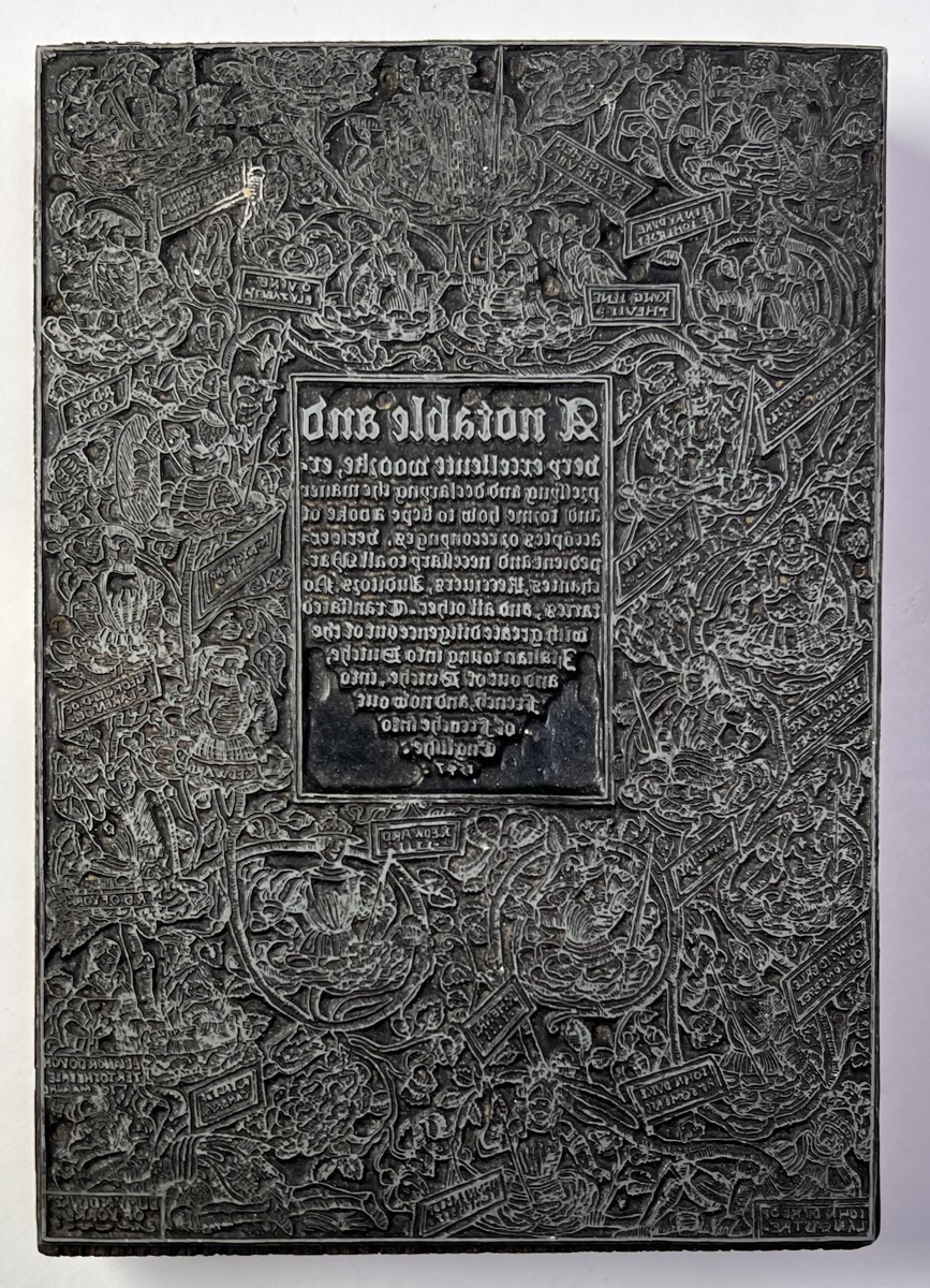 Antieke drukplaat (printblock) bestaande uit chemisch gegraveerd metaal gemonteerd op een houten drager, uitgevoerd in hoogdruk techniek (reliëfdruk). De stijl is neogotisch met een dicht ornamentwerk van florale en figuurlijke motieven rond een centrale tekst in spiegelbeeld. Het blok dateert uit circa 1880–1920 en werd gebruikt voor het drukken van formele documenten of certificaten.