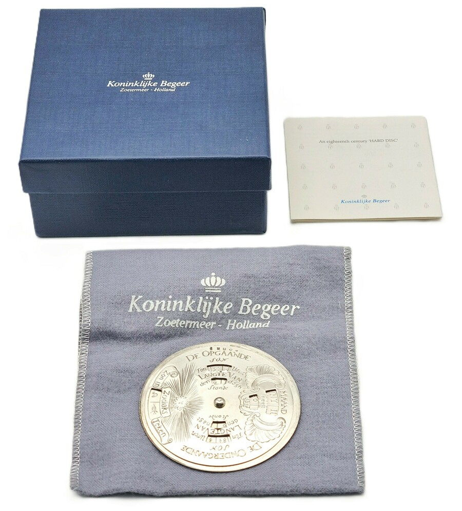 Een zilveren eeuwigdurende kalender, uitgevoerd in 925/1000 zilver door Koninklijke Begeer in Zoetermeer Nederland, gedateerd 1998 (jaarletter O). De kalender bestaat uit meervoudige roterende schijven, gemaakt door stansen en graveren. De keerzijde bevat historiserende decoraties met zodiaktekens en zonnewijzer ornamenten. Gekeurd met meesterteken B en staande leeuw 1, compleet met doos en hoes.