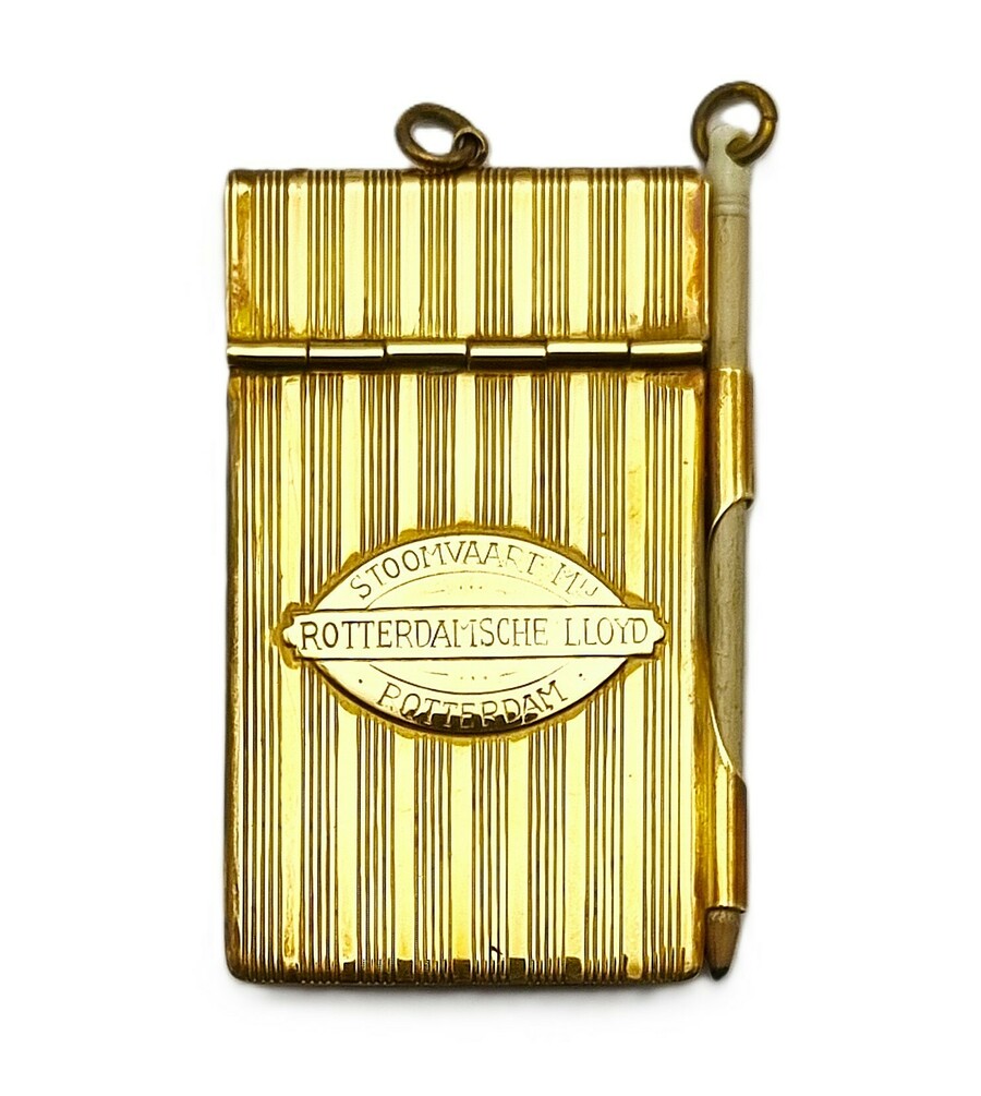 Messing balboekje uitgevoerd in Art Deco uit circa 1920–1935. Het balboekje diende als relatiegeschenk van de Rotterdamsche Lloyd Stoomvaart Maatschappij (RL). De rechthoekige behuizing is gedecoreerd met verticale lijngravures en een ovaal medaillon met de naam van de rederij. Het bevat het originele potlood en een notitieblok.