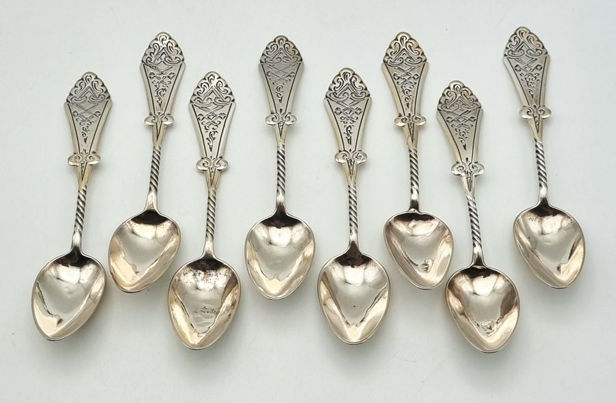 Een set van acht zilveren theelepels uit de tweede helft 19e eeuw, uitgevoerd in neorenaissance stijl, Nederland. De theelepels zijn vervaardigd met een gedraaide steel en rijk gedecoreerde, symmetrische spatel. Het materiaal is tweede gehalte zilver, gekeurd met het Nederlandse zwaardje.