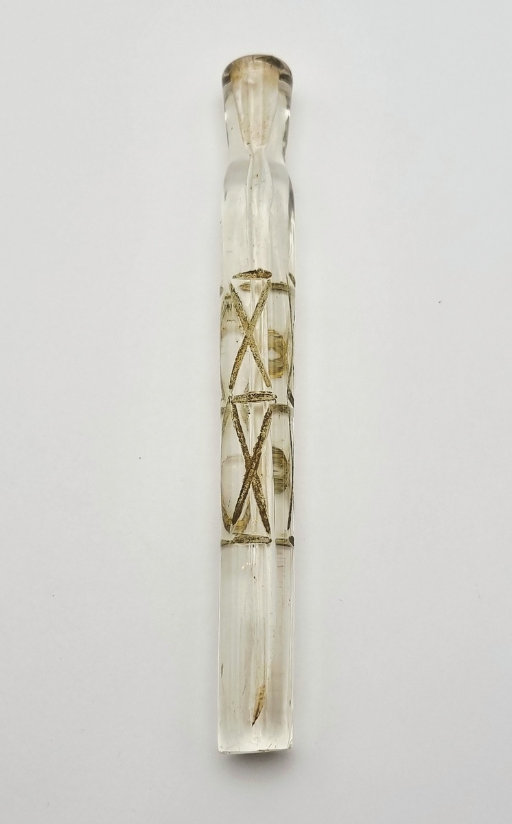 Een Victoriaanse glazen tranenvanger uitgevoerd in helder loodglas door mondblazen en slijptechniek, uit de tweede helft 19e eeuw, Engeland. Het cilindrische lichaam is gedecoreerd met uitgeslepen X-vormige patronen, waarin goud is aangebracht door middel van koudschildering.