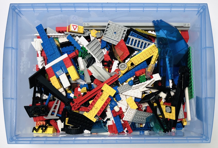 Lego bouwstenen in ABS-kunststof, bestaande uit een mix van elementen uit diverse thema's. De stenen dateren uit de periode circa 1970–2010 en bevat platen, wielen en speciale constructieonderdelen in de kenmerkende basiskleuren.
