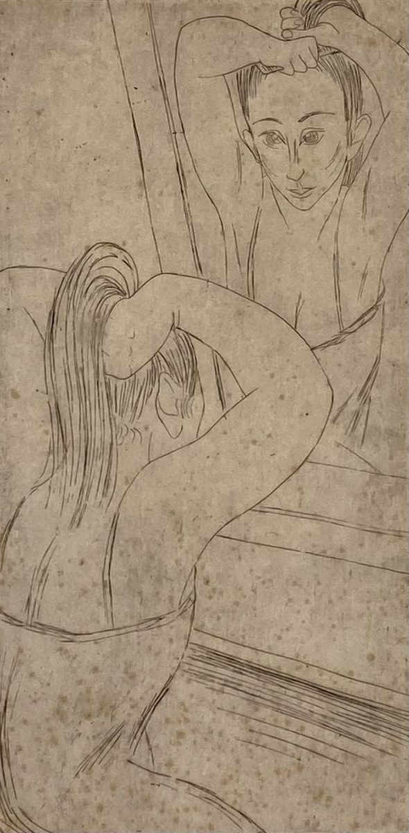 Ets op papier, vrouw voor een spiegel, weergegeven in een pose met fijn lijnenspel en beperkte tonaliteit. De voorstelling toont een achteraanzicht en spiegelbeeld, uitgevoerd in moderne figuratieve stijl. Geen zichtbare signatuur, tweede helft 20e eeuw.