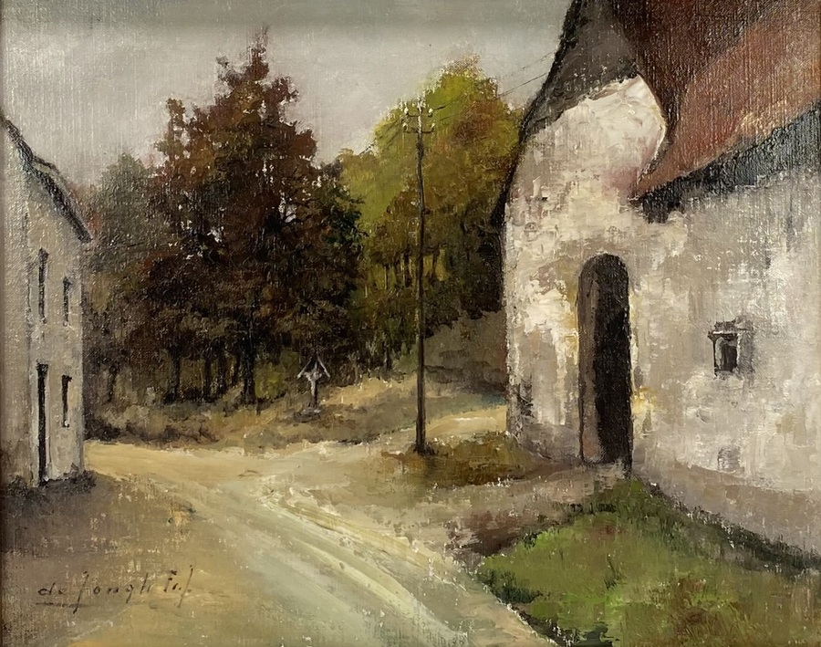 Olieverf op doek, dorpsstraat met boerderijen in ingetogen stijl. Links gebouw met ramen, rechts boerderij met poort en op de achtergrond bomen. Linksonder gesigneerd “de Jongh Fr.”. In klassieke donker-goudkleurige lijst met een brede montuur, 20e eeuw.