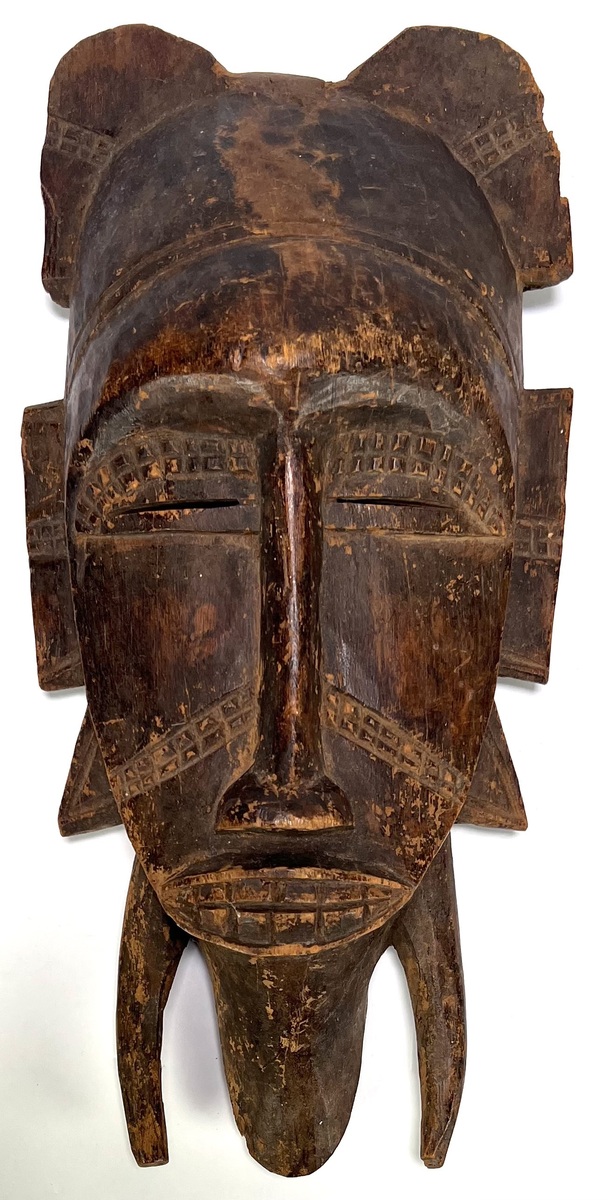 Gesneden houten initiatiemasker van de Senufo uit Ivoorkust, midden 20e eeuw. Het masker behoort tot het type “Lukwakongo”, gebruikt tijdens Poro ceremonies. Handgesneden hout met natuurlijke bruine patina en geometrische decoratie. Langgerekte gelaatsvorm met hoornachtige onderdelen en oude etiketten op de achterzijde. Voorbeeld van West-Afrikaanse rituele houtsnijkunst.