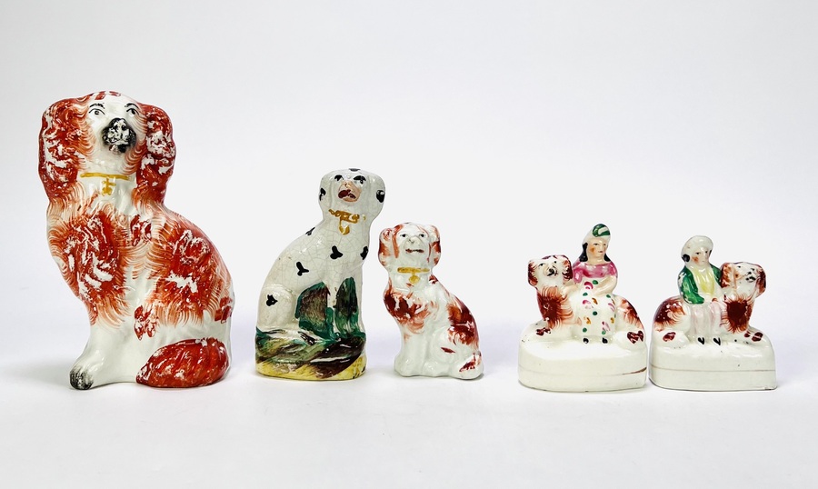 Vijf keramische Staffordshire beelden, daterend uit de periode eind 19e eeuw, handgeschilderd met roodbruine en zwarte vlekken en goudkleurige halsbanden. Twee beelden tonen de honden met een menselijke figuur op de rug.