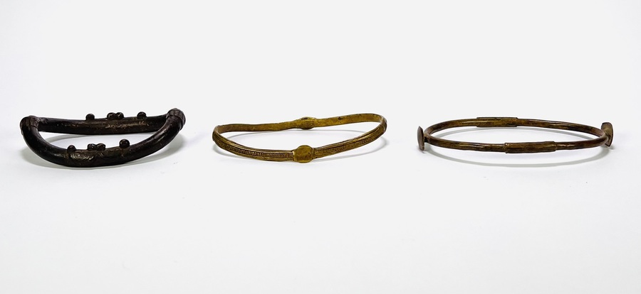 Drie etnografische armbanden van brons en messing, gegoten volgens de cire perdue-techniek en voorzien van gegraveerde en reliëfdecoraties. Afkomstig uit West-Afrika en Centraal-Afrika, daterend uit de periode ca. 1900–1960. De armbanden tonen diverse vormen, variërend van valuta object tot status- en siervoorwerp.