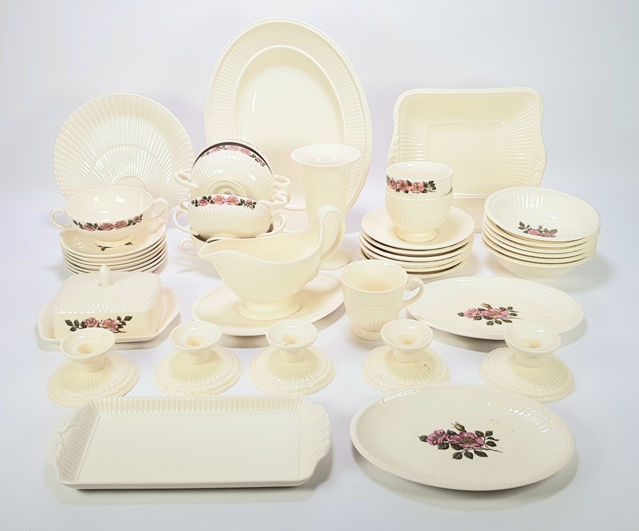 Queens Ware van Wedgwood, in het Edme-model met verticaal geribbelde randen, Engeland, eind 20e eeuw. Het lot omvat diverse stukken, waaronder borden, terrines en kandelaars. De stukken zijn deels gedecoreerd met een roosmotief in overglazuur transferdecoratie.