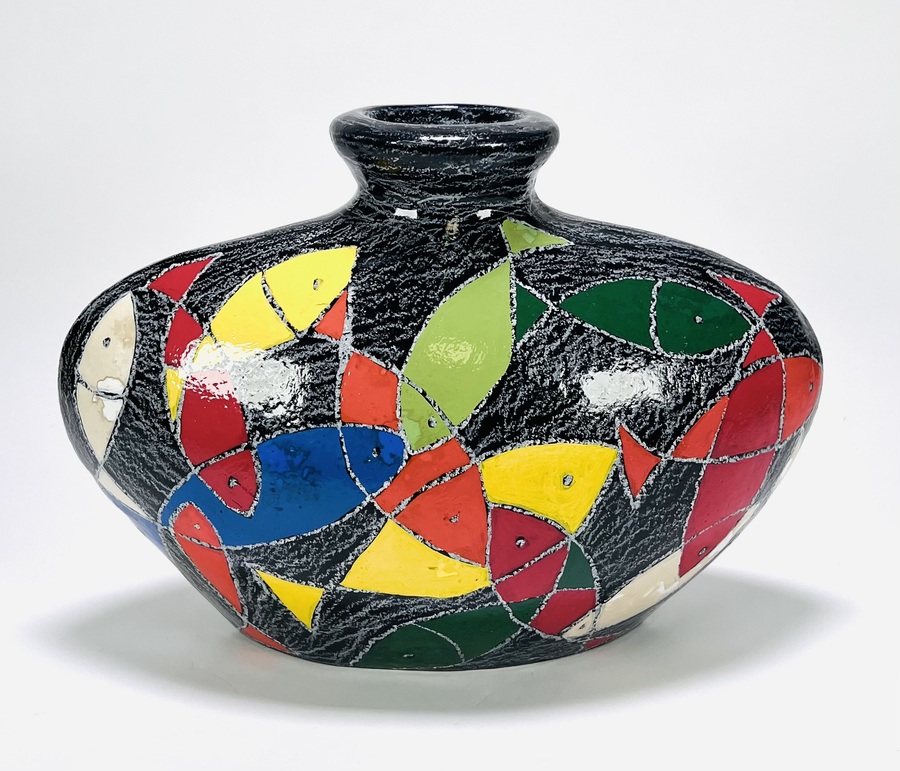 Keramische vaas in abstract figuratieve stijl, vervaardigd middels giettechniek met een sgraffito en glazuurtechniek. De vaas uit circa 1950–1975 heeft een platte bolvorm en een zwart gestructureerde achtergrond. Het decor bestaat uit gestileerde vissen in felle kleuren rood, geel, groen en blauw.