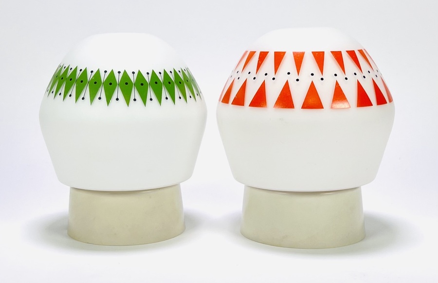 Paar plafondlampen met eivormige kappen, vervaardigd uit melkglas met een kunststof Niko fitting. De lampen zijn uitgevoerd in Mid-century modern stijl en dateren uit de midden 20e eeuw. De decoratie bestaat uit een strak geometrisch patroon van ruiten en driehoeken in contrasterend groen en oranjerood.