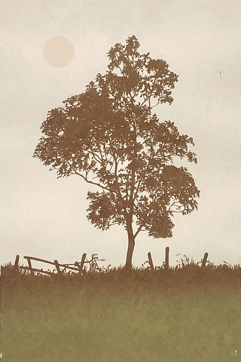 Zeefdruk op papier door Giwa, circa 1970–1990, uitgevoerd in een minimalistische, decoratieve stijl. De voorstelling "Midsummer II" toont een sterk gestileerd landschap met een solitaire boom als silhouet bij een houten hek, met op de achtergrond een zon in zachte bruintinten. Linksonder oplagenummer 28/400, midden onder titel en rechtsonder signatuur.