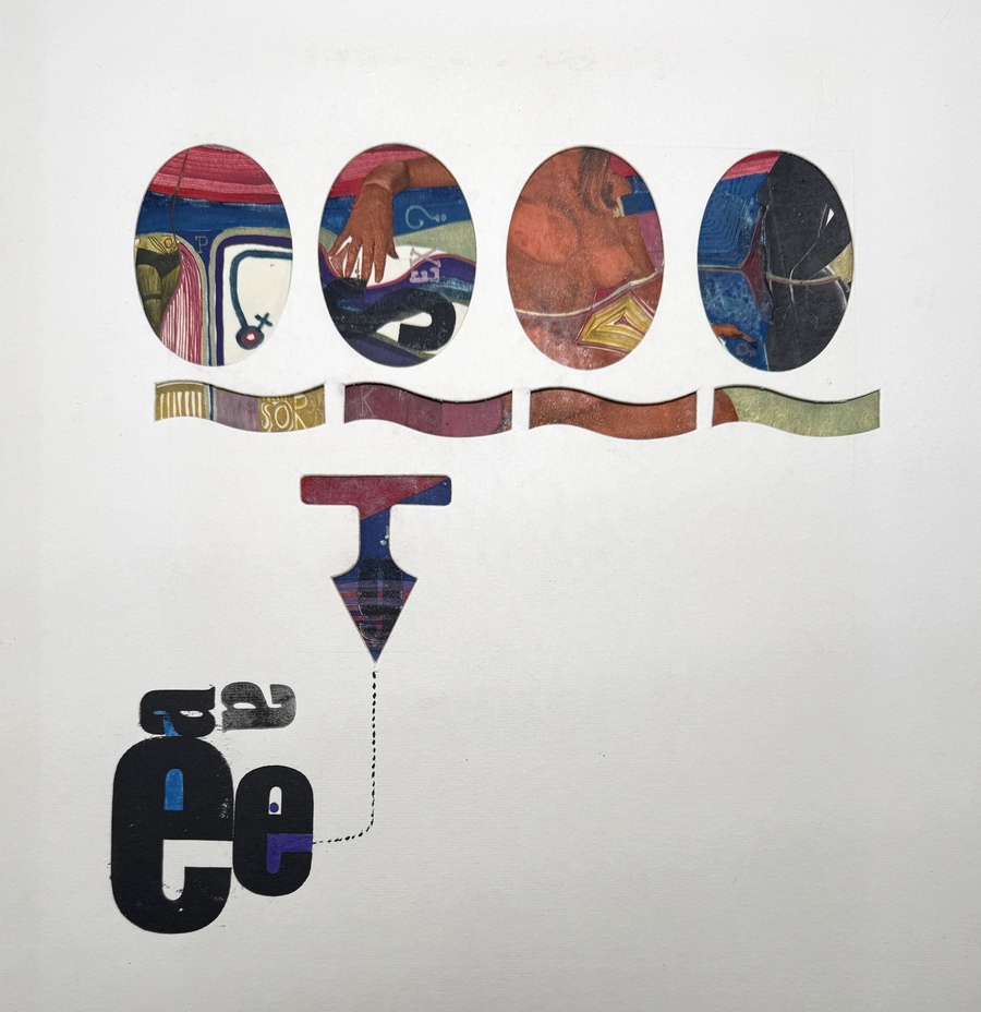 Abstract figuratief werk op papier, uitgevoerd in gemengde techniek (gouache, potlood en collage/sjabloon), daterend uit de periode circa 1950–1975. Het werk is getiteld "V Nackt ligt in ovaal" en toont vier collages van figuren en symbolen in warme rood- en blauwtinten. De compositie bevat gestencilde letterfragmenten en grafische pijlen in een modernistische stijl.