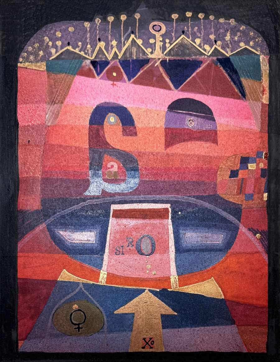 Abstract figuratief werk op papier, uitgevoerd in gemengde techniek gouache en collage door Tom te Velde (1943). De kunstenaar signeerde het werk linksonder, rechtsonder titel en gedateerd 1967. Het werk is getiteld "maskerade O" en toont geometrische vormen met symbolen in warme rood en paars tinten.