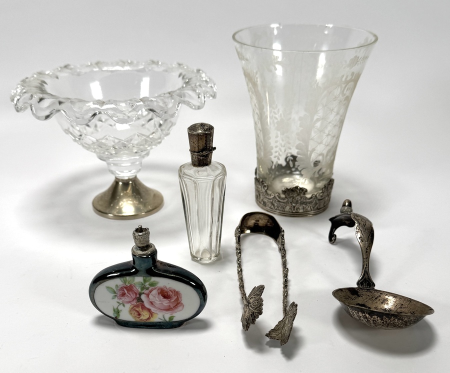 Antieke accessoires en tafelgerei, vervaardigd uit geslepen glas, zilver en verzilverd metaal. De collectie dateert uit de tweede helft 19e eeuw in Victoriaanse neostijlen. Het lot omvat onder andere een geslepen schaal op voet, een beker met metalen houder, een geëmailleerd parfumflesje met roosdecoratie en twee zilveren scheplepels.
