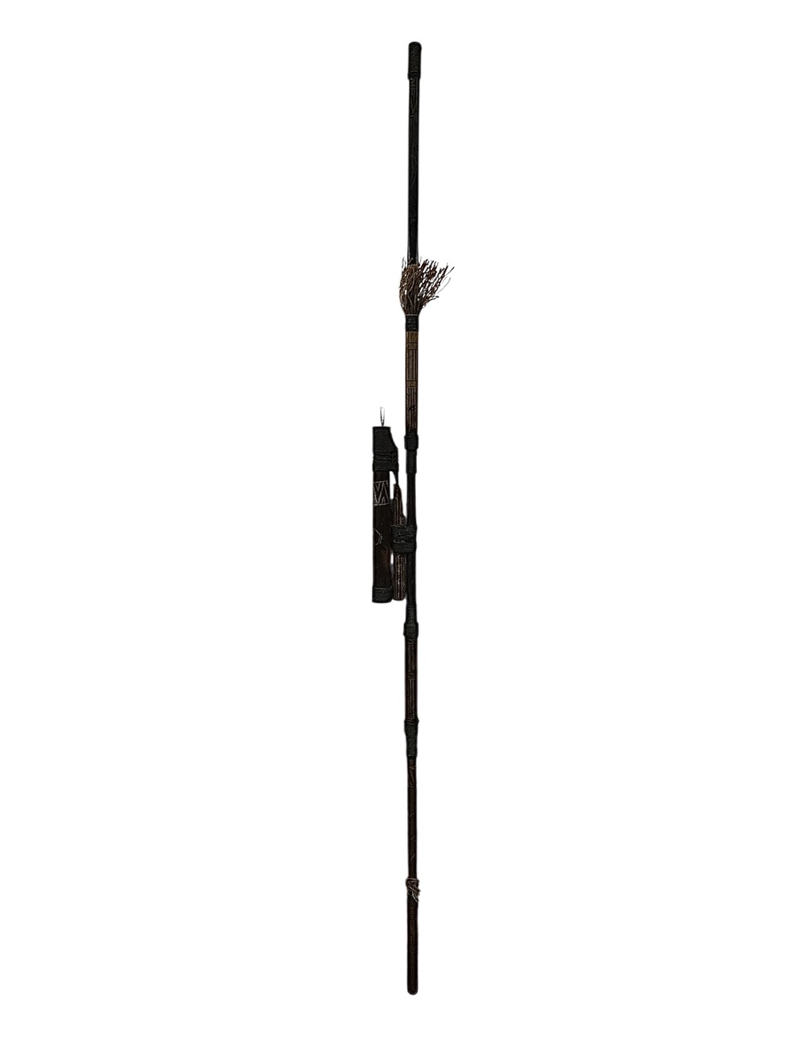 Jachtattributen bestaande uit een lange blaaspijp en twee houten kokers pijlen, vervaardigd uit hardhout en natuurlijke vezels middels houtsnijwerk en brandgravure. Hierbij een geweven hoofdtooi met hoorn en schelpen. De stijl is kenmerkend voor de traditionele Dayak jachtcultuur van Borneo en dateert uit de midden 20e eeuw.