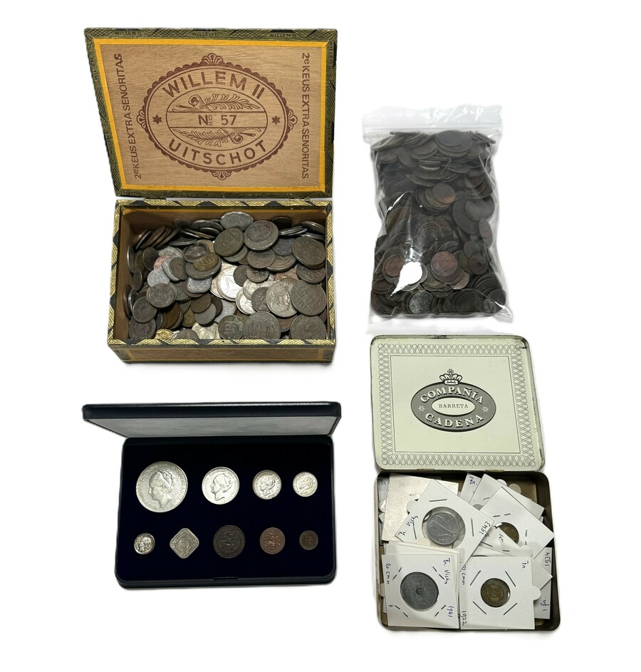 Collectie munten van Frankrijk en Nederland, geslagen uit diverse legeringen waaronder zilver en nikkel. De munten dateren voornamelijk uit de periode circa 1920–1960 en tonen een sterke vertegenwoordiging van de oorlogs- en naoorlogse periode. Het lot bevat een formele set en een hoeveelheid circulatiemunten in verschillende condities.