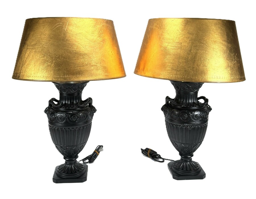 Paar neoklassieke tafellampen in empirestijl, vervaardigd uit zwart gepatineerd metaal met giettechniek. De balustervormige voet is voorzien van lauwerkransen, leeuwenkoppen en cannelures geplaatst op een vierkante sokkel. Afgewerkt met goudkleurige lampenkappen, Europa, midden 20e eeuw.