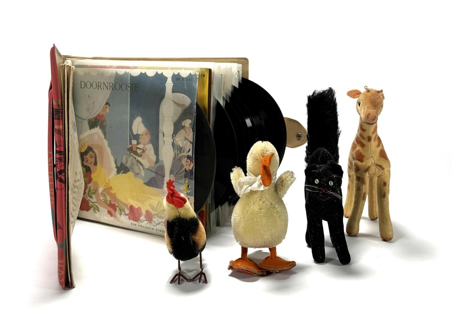 Lot van kindersprookjes op singles in de Wonderland serie van Artone en Philips. De verzameling uit midden 20e eeuw is gebundeld in een platenkoffer. De platen zijn een uitgave van DUCOCO. Hierbij vier vintage speelgoedfiguren van pluche en vilt.
