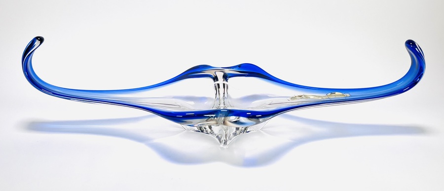 Murano mondgeblazen glasschaal, Italië ca. 1950–1960. De schaal is uitgevoerd in helder glas met een dikke kobaltblauwe rand met een asymmetrische, stervormige configuratie met vier uitgerekte punten. De vormgeving is het resultaat van handgevormde bewerking, sticker bovenkant schaal.