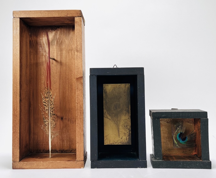 Drie houten wandkistjes met assemblagekunst door de hedendaagse kunstenaar Rosalie Kampinga. De kistjes dateren uit circa 1990–2020 en zijn van Nederlandse herkomst. Twee kistjes bevatten een veer en een kistje bevat een afdruk van een veer.