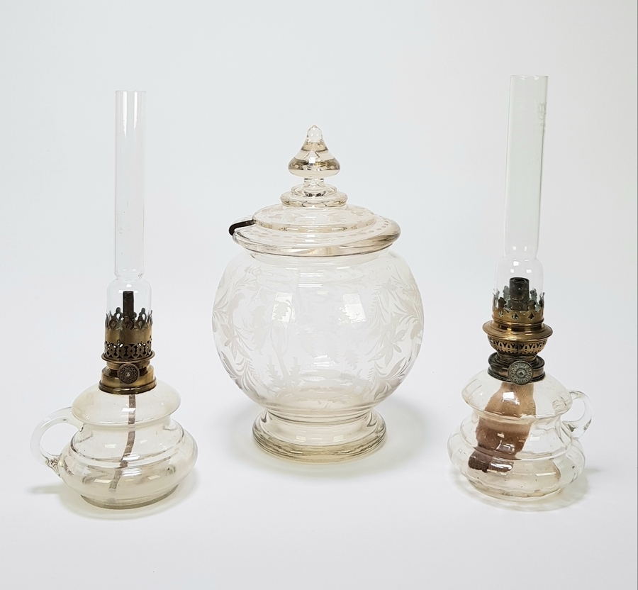 Antiek glaswerk uit de periode circa 1870–1900, van Centraal-Europese herkomst. Bestaande uit twee kleine olielampen met glazen schoorsteen en messing branders en een gedecoreerde glazen pot met deksel. De dekselpot is gedecoreerd met florale motieven in een romantische stijl.