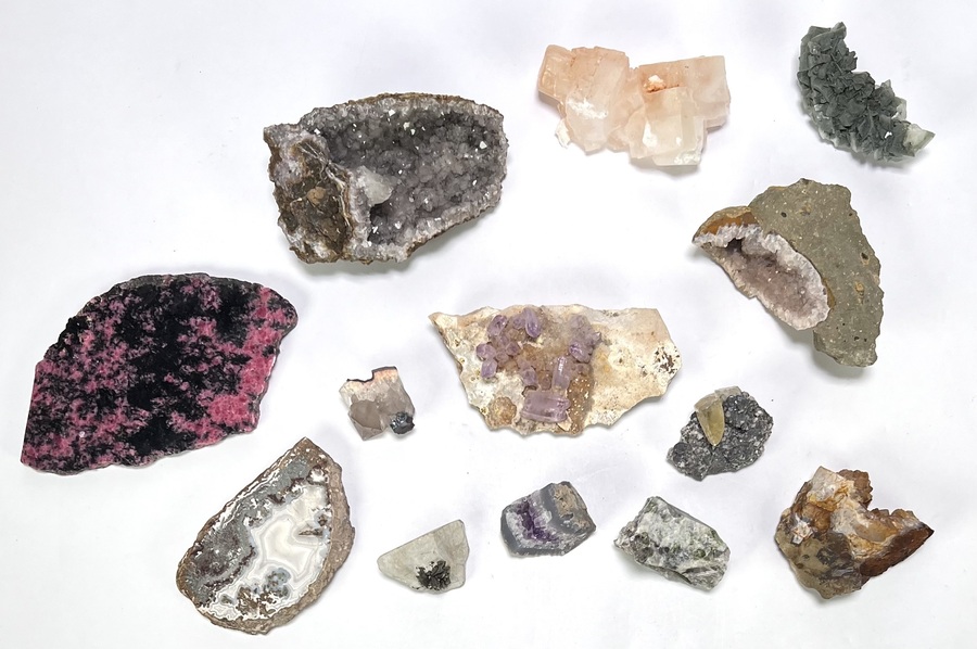 Collectie van 13 mineralen en gesteentemonsters van geologische herkomst. De verzameling bestaat uit kwarts amethist, smoky quartz, agaat, calciet en rhodoniet in diverse kleuren en kristalstructuren. De mineralen tonen natuurlijke kristallisatie en geodefragmenten.