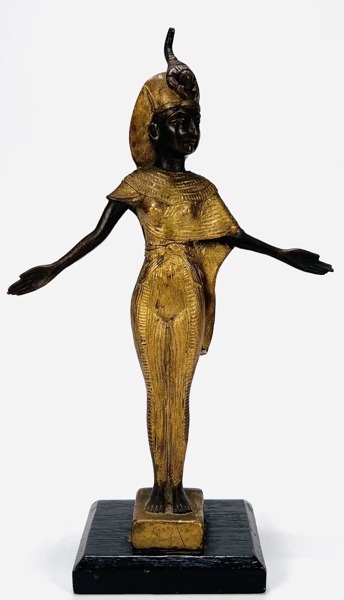 Messing beeld van een Egyptische koningin in een dynamische houding met gespreide armen. Het beeld is afgewerkt met een donkere patina en goudkleurige details op de geplisseerde kleding en de uraeus hoofdtooi. Dit Egyptisch revival beeld dateert uit de 20e eeuw en is gemonteerd op een zwart gelakt houten basis